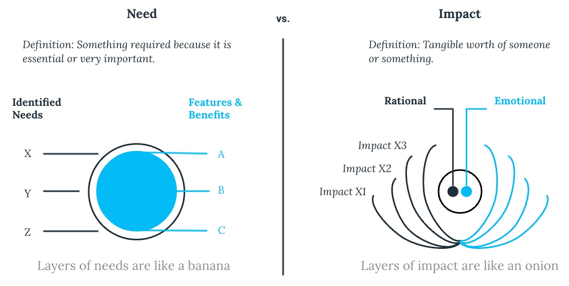 Your customer’s needs are more like an onion, with overlapping layers that can be peeled back by asking the right questions. By diagnosing a customer’s needs, your sales team can uncover the underlying impact they are looking to achieve. And impact is what differentiates the nice-to-have from the must-have solutions.